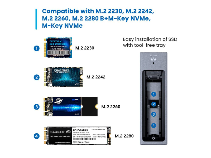O seu SSD M.2 NVMe tem um conector M? Coloque o SSD M.2 NVMe facilmente na caixa. Utilize um SSD M.2 NVMe/PCIe de até 80 mm.