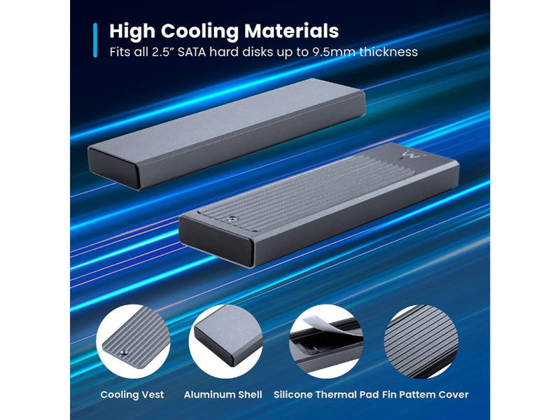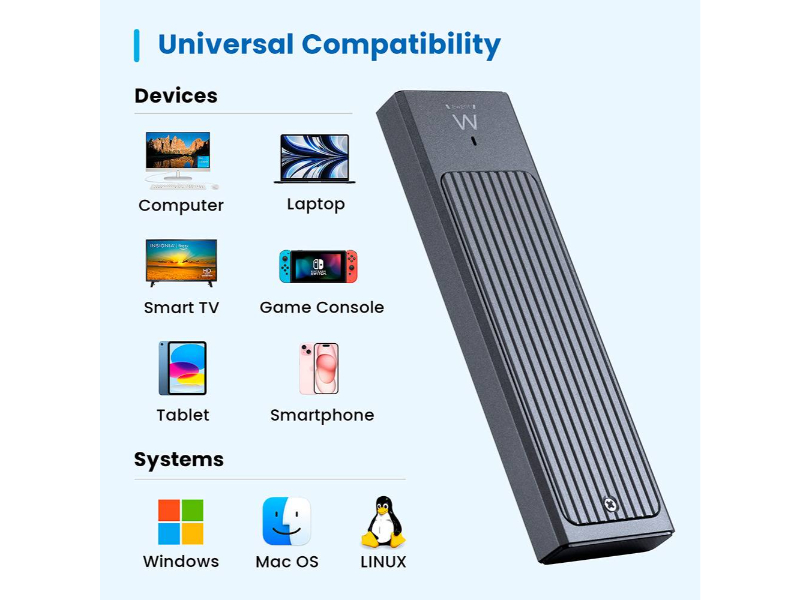 A caixa em alumínio para SSD inclui um cabo USB-C para USB-C e um cabo USB-C para USB-A. O seu SSD M.2 NVMe/PCIe estará pronto a utilizar em apenas alguns minutos.