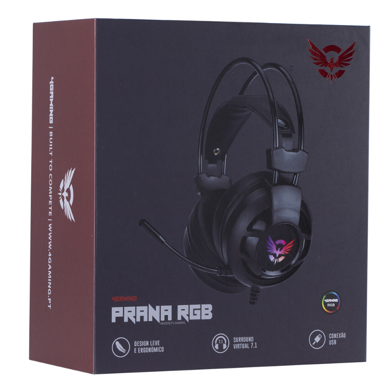 Os headsets PRANA RGB vêm acondicionados numa embalagem Premium, de estrutura rígida, resistente e agradável ao toque.