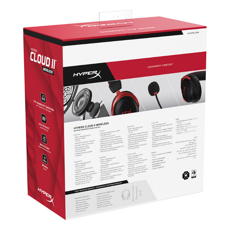 Não é de admirar que se tenha tornado o headset preferido por milhões de jogadores. Temos o orgulho de apresentar o HyperX Cloud II Wireless DTS. Com uma rápida ligação sem fios de 2,4Ghz, uma bateria de longa duração de 30 horas*, e 20 metros de alcance sem fios**, está preparado para mais do que um dia inteiro de conforto e liberdade sem fios. Os controladores de 53mm emitem um som impressionante e quando combinados com DTS® Headphone:X®*** áudio espacial pode escapar para os seus mundos de jogo de fantasia favoritos.