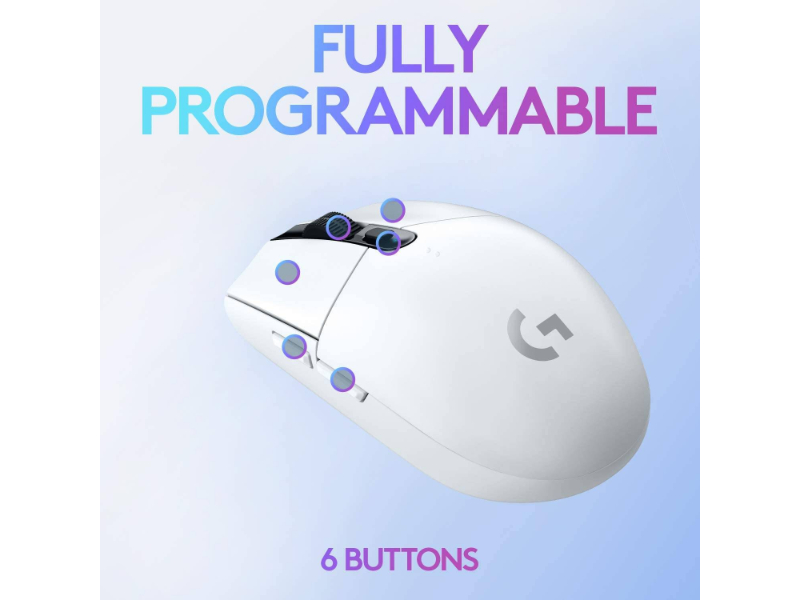 O G305 oferece 10 milhões de cliques nos dois botões principais. O G305 também possui um botão na roda de rolagem, um botão para DPI e dois botões laterais que podem ser programados ao seu gosto usando o Logitech Gaming Software.